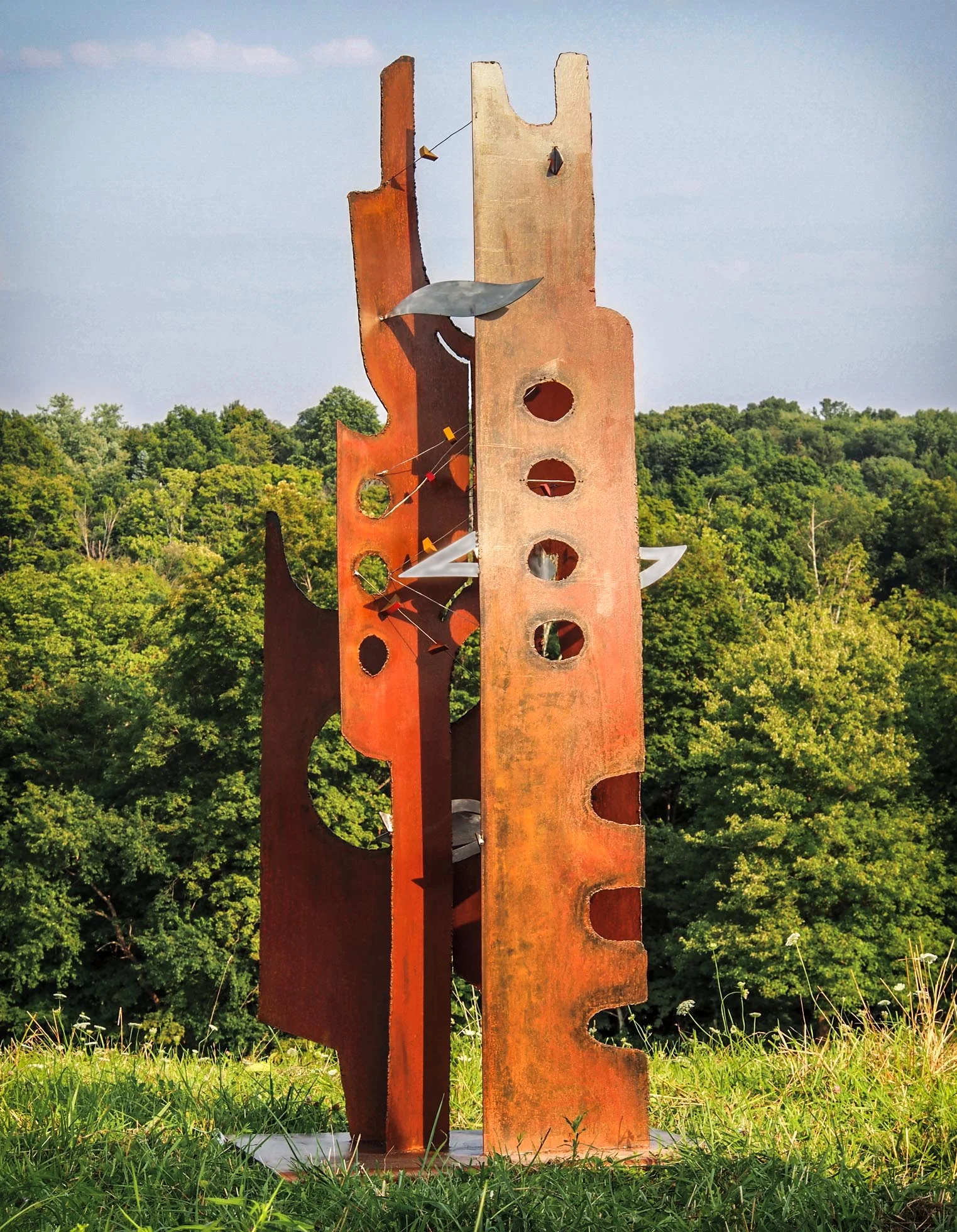 The sculpture is made from painted 1/8" steel and painted wood pieces.