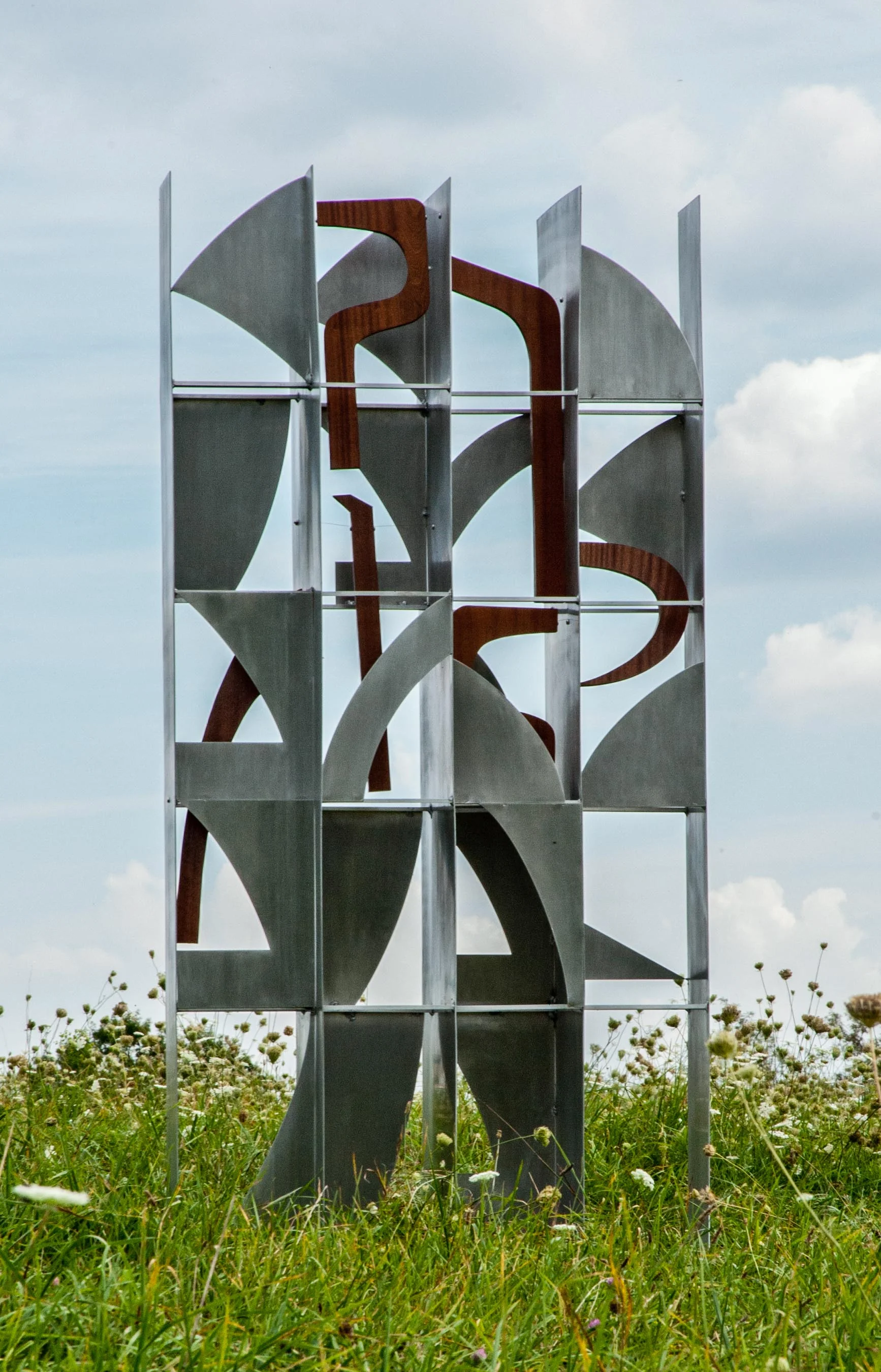 This sculpture is dedicated to machine farming with the reminiscence of hand farming. The sculpture was created out of aluminum and sapele mahogany. I chose sapele mahogany for its beauty, the same beauty of the hands that tended the soil. I used aluminum to represent the entrance of new technology, machine farming. The sculpture sits upright at Saunders Farm. The openings in the sculpture lets the viewer see though to the sustainable fields where the cows roam free.